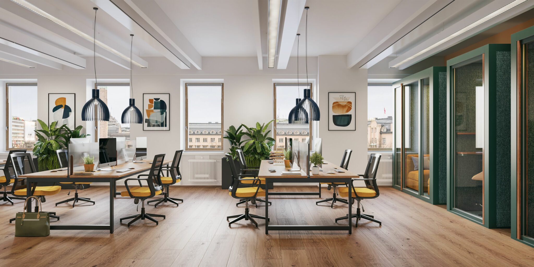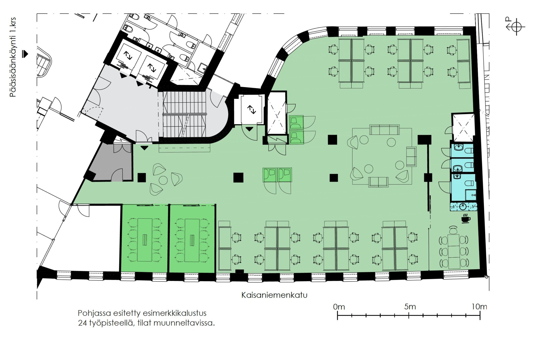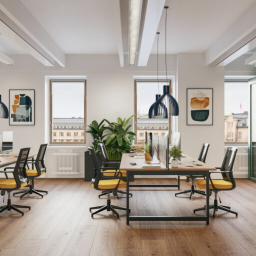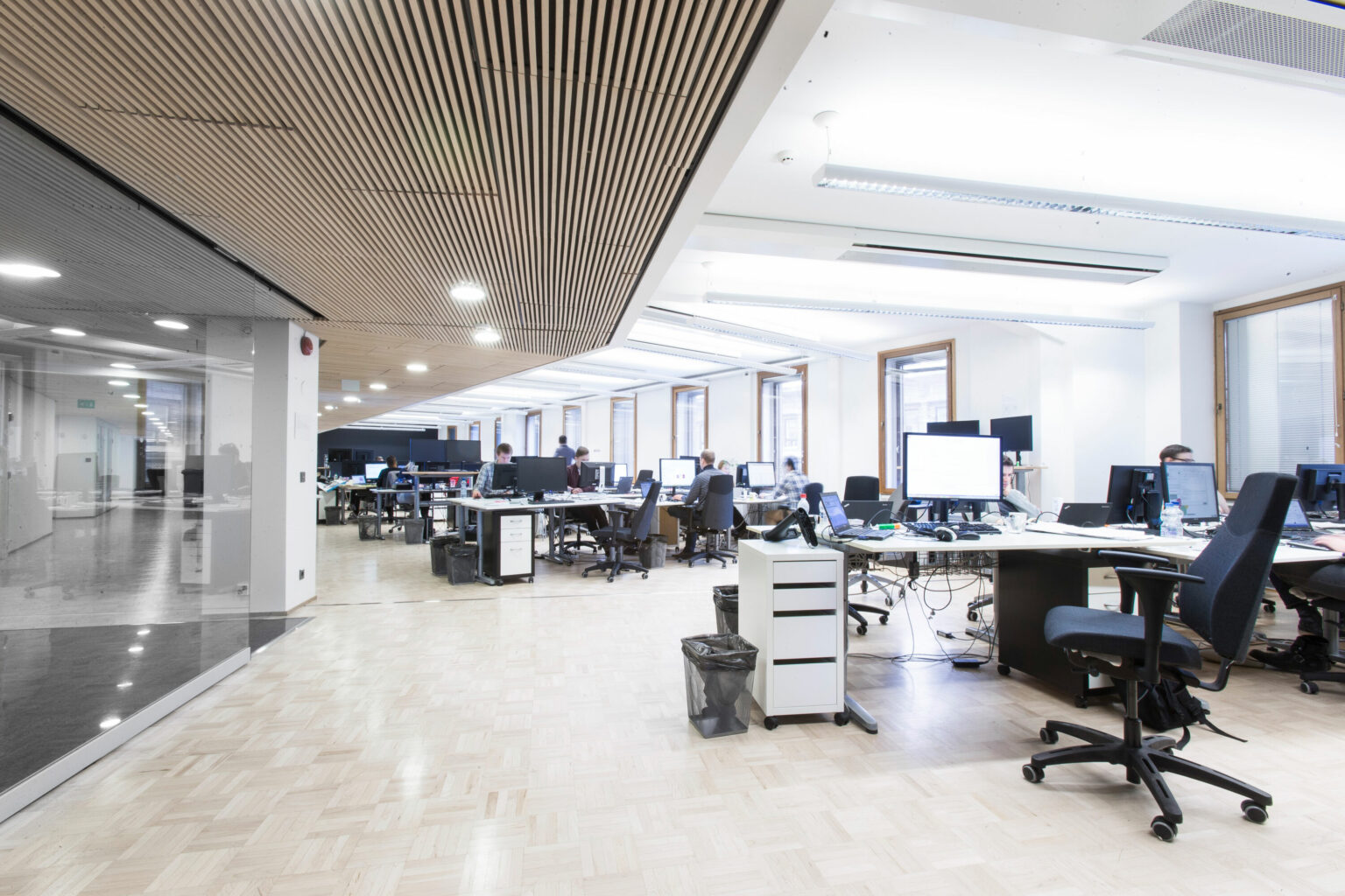 5. kerroksen avotoimistotilaa, jonka yleisilme moderni ja siisti