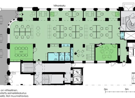 Kiinteistön historiaa henkivät, moderniin toimistokäyttöön täysin kunnostetut tilat luovat upeat puitteet erilaisille yrityksille. Osassa tiloista on saneerauksen yhteydessä kunnostettuja, alkuperäisiä elementtejä kuten upea rappukäytävä ja vanha kakluuni. Kiinteistöstä löytyy sekä perinteistä huoneistotoimistotilaa että helposti muunneltavaa avotilaa.