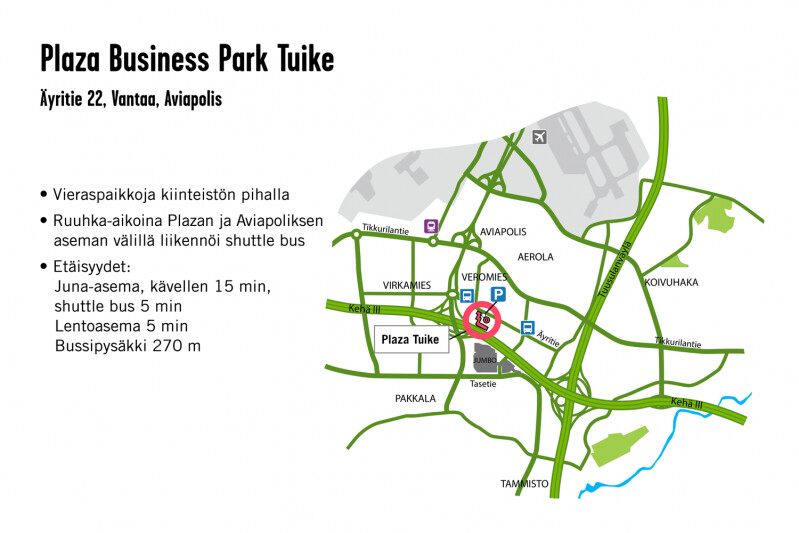 Kulkeminen Plaza Business Park Tuikkeeseen eri puolilta pääkaupunkiseutua on sujuvaa sen sijaitessa isojen väylien, Kehä III ja Tuusulanväylän kulmauksessa, Kauppakeskus Jumboa vastapäätä. Tikkurilaan on autolla matkaa 10 minuuttia, Leppävaaraan 20 ja lentokentälle vain 5. Työmatkan suunta on aina pääkaupunkiseudun ruuhkia vastaan. Pihalla on Business Parkin pysäköintihalli, josta löytyy useita sähköauton latauspisteitä. Asiakaspysäköintipaikkoja on runsaasti suoraan talojen edustalla yrityspuiston piha-alueella.