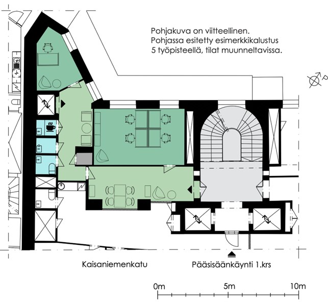 5. kerroksen toimivapohjainen toimistohuoneisto sisäpihanäkymillä.
