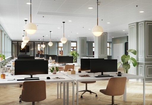 Hyväkuntoinen 4. kerroksen monitilatoimisto tunnelmallisessa jugendlinnassa. Tilavat, valoisat ja korkeat huoneet.