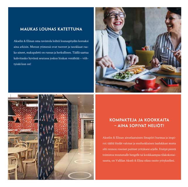 Akseli & Elina tarjoaa työhyvinvointia ja yhteisöllisyyttä tukevia, persoonallisia toimitiloja, jotka on suunniteltu ja toteutettu sopimaan hyvin yhteen nykypäivän työelämän vaatimusten kanssa. Valoisat ja laadukkaat, mutta rennon rosoiset toimitilat luovat innostavan ja tuloksellisen tahdin työnteolle, itsensä kehittämiselle ja uuden luomiselle joka päivä.