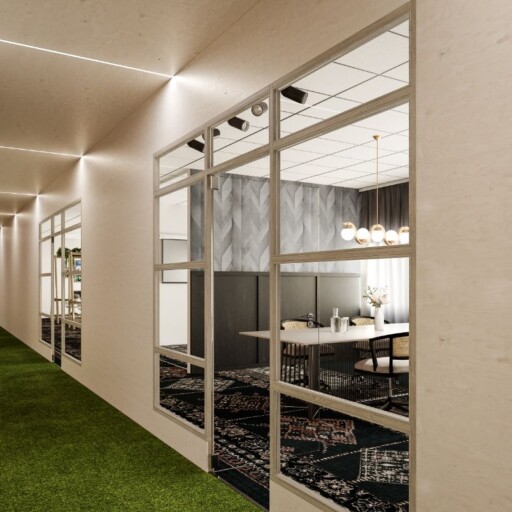 Katutason toimistohuoneisto, josta ikkunat sisäpihan suuntaan.